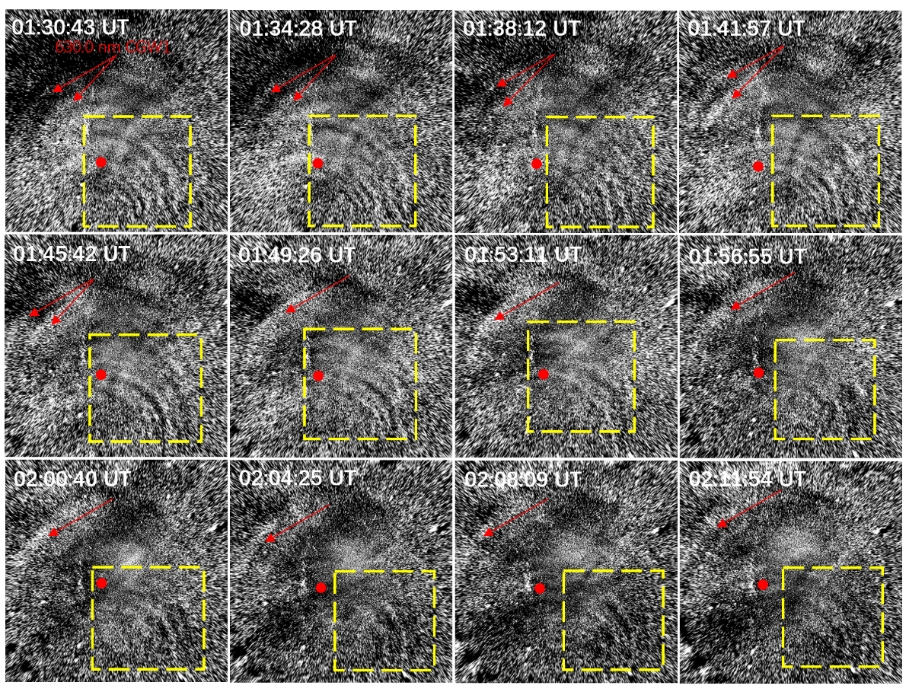 图三. 巴西圣马利亚台站观测的热层环形重力波,黄色虚线方框是泄漏的OH气辉辐射信号。