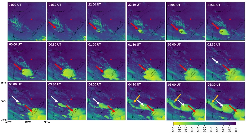 近期,中国科学院国家空间科学中心太阳活动与空间天气全国重点实验室中高层大气和电离层研究室与巴西国家空间研究院(INPE)合作,利用巴西圣玛丽亚观测台站的双通道气辉观测系统(630.0 nm与OH波段),结合卫星探测,于2023年9月17-18日在巴西南部区域同时观测到中间层顶和热层大气强烈的环形重力波事件(CGWs),该波动现象持续达10小时以上,振幅扰动高达24%(而过去观测的CGWs的平均振幅仅为2%-3%),波心移动超过400公里。通过GOES-16卫星观测发现,CGWs是由快速移动的低层大气超强对流系统激发产生(见图一)。此CGWs的持续时间、波动振幅以及波源移动速度都非常罕见(见图二)。