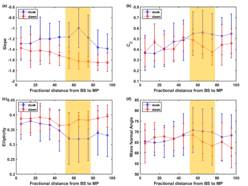 图1 木星磁鞘侧翼湍流和波动特征的径向演化特性。(a)到(d)分别代表湍流谱指数、磁场压缩性、椭度和法向角,红色和蓝色分别表示晨侧和昏侧的结果。黄色高亮区域为晨昏差异最大的区域。