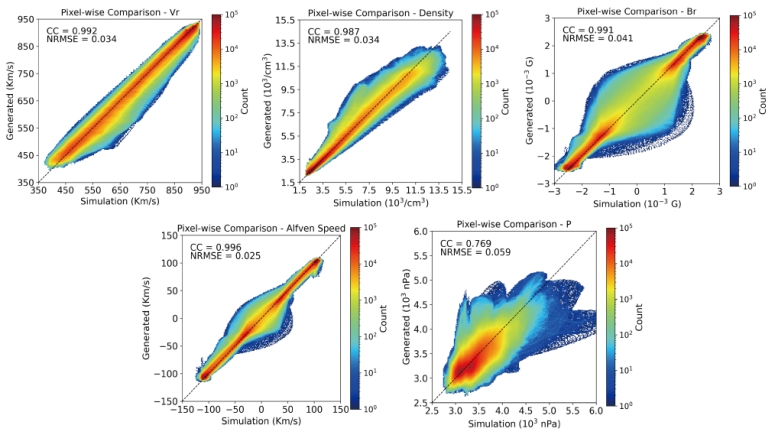 模型在测试集上取得了高精度的重建结果:径向速度、数密度和径向磁场的相关系数分别达到0.992、0.987和0.991;推导的Alfvén速度与动压的相关性分别达到0.996和0.769。模型不仅准确再现了关键太阳风参数的空间分布,还成功捕捉了其随时间变化的动态演化规律。