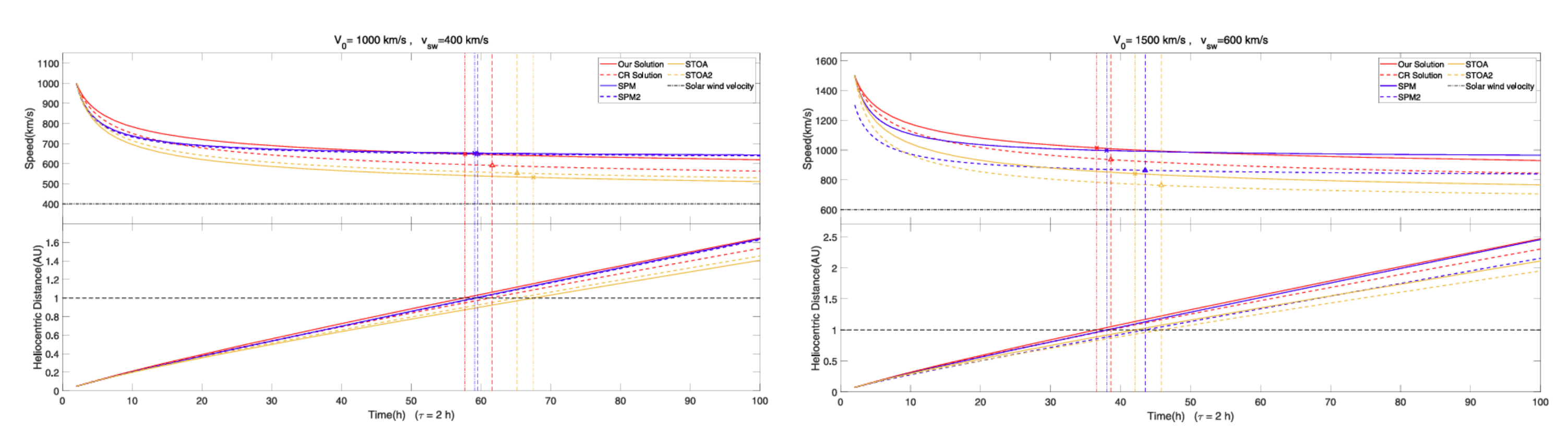 图2:新爆炸波解析解(红色实线)与多种模型(其他线型)预报效果定量对比图(例:初始激波速度分别为1000、1500 km/s,背景太阳风速度分别为400、600 km/s)