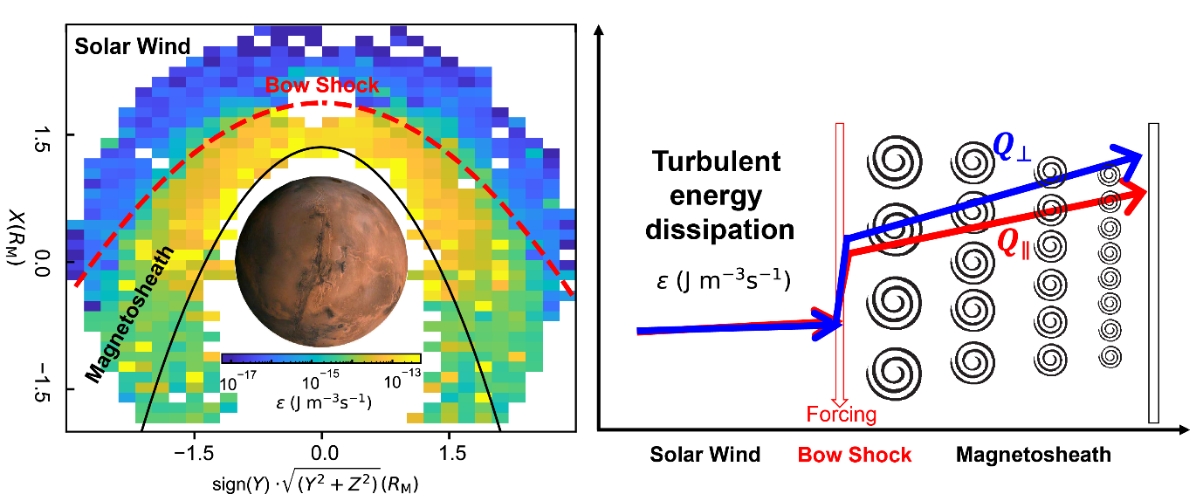 图1,火星弓激波上下游太阳风湍流能量串级率的空间分布图(左)和湍流能量串级率跨越弓激波的空间演化卡通示意图(右)。