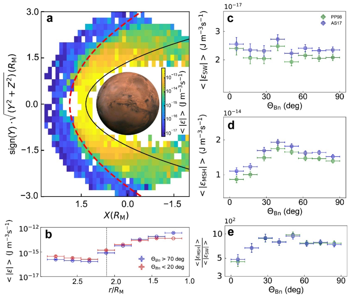 近日,太阳活动与空间天气全国重点实验室王赤院士团队的蒋文策博士后、李晖研究员联合法国综合理工学院、阿根廷布宜诺斯艾利斯大学和英国伦敦大学学院等合作者,基于 MAVEN 卫星提供的数年高分辨率磁场和离子数据,开展了火星附近太阳风湍流能量串级率的统计分析,重点探究火星弓激波作用前后太阳风湍流能量串级率的演化规律。该研究首次通过卫星观测,表征了 MHD 尺度下湍流能量串级率的空间演化特征及其与弓激波参数的关联性。核心发现显示,从太阳风向磁鞘过渡时,湍流能量串级率平均增强三个数量级;斜激波和准垂直激波下游的湍流能量串级率,高于准平行激波下的观测结果。这些成果首次为激波法向角与湍流能量耗散增强的相关性提供直接观测证据,为理解空间等离子体中普遍存在的激波 - 太阳风湍流相互作用过程提供了重要启示。