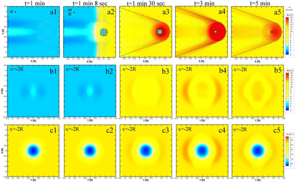 图1展示了z=0和x=-2R平面的磁场强度及x=-2R平面的等离子体数密度在五个时刻(1分、1分8秒、1分30 秒、3分和5分)的结果。1分为初始条件下的稳态结果,尾迹区域出现等离子体空腔,且其内部磁场增强,与既有模拟结果一致。与此同时,在x=1.5R处引入磁场跃变。1分8秒时这个间断面传至月球下游约0.5R处,月核产生感应电流。感应电流在月核内产生的磁场抵消了外部磁场变化,而月核外的感应磁场方向与外部磁场一致。两者叠加后,月核以外至月表以内区域的总磁场强度高于月表以外的背景场。1分30秒时,月核感应电流增强,月表内的磁场也增强,月球临边附近出现磁场和等离子体密度的增强(即临边压缩)。3分时,内部感应电流及磁场进一步增强,临边压缩更为显著。5分时,内部磁场减弱,临边压缩随之减弱。
