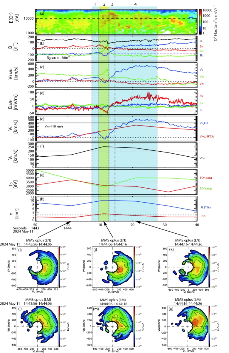 1. 20245月超强磁暴期间MMS3卫星观测到富含能量O⁺离子的磁层顶磁重联离子扩散区。