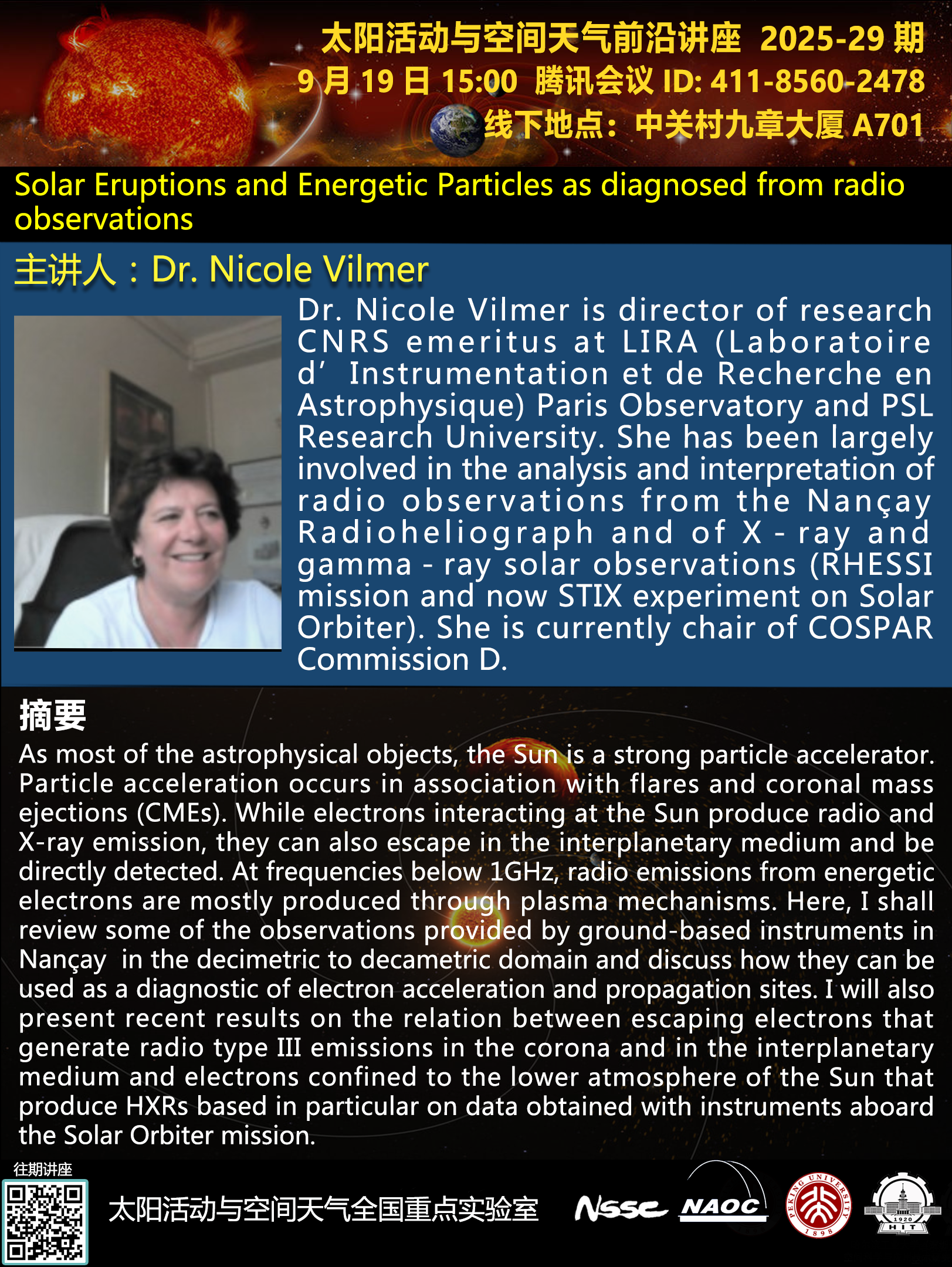 讲座嘉宾:Dr. Nicole Vilmer(LIRA, Paris Observatory)