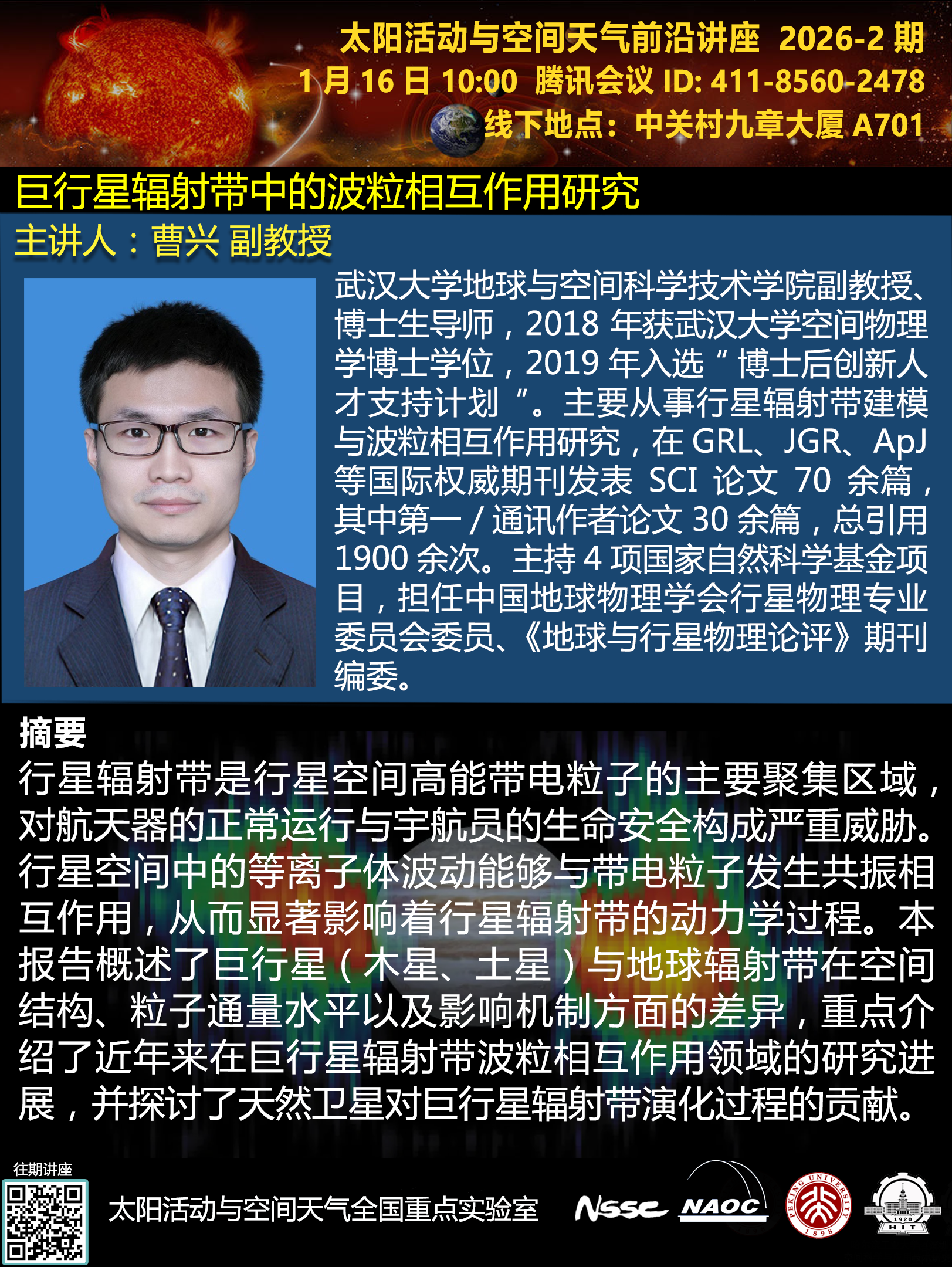 ![]() | 曹兴,武汉大学地球与空间科学技术学院副教授、博士生导师,2018年获武汉大学空间物理学博士学位,2019年入选“博士后创新人才支持计划”。主要从事行星辐射带建模与波粒相互作用研究,在GRL、JGR、ApJ等国际权威期刊发表SCI论文70余篇,其中第一/通讯作者论文30余篇,总引用1900余次。主持4项国家自然科学基金项目,担任中国地球物理学会行星物理专业委员会委员、《地球与行星物理论评》期刊编委。 |