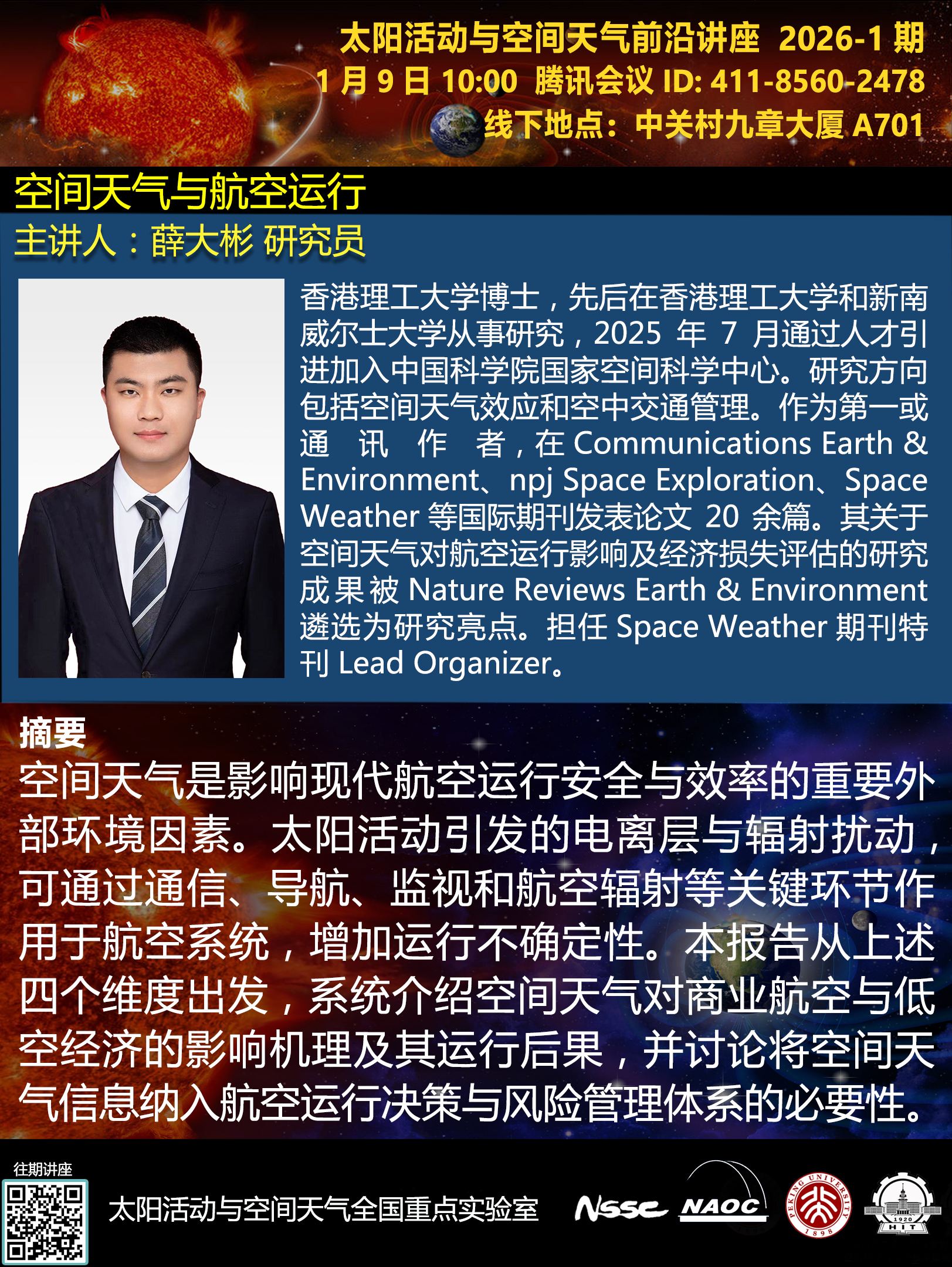 ![]() | 薛大彬,香港理工大学博士,先后在香港理工大学和新南威尔士大学从事研究,2025年7月通过中科院BR-B人才计划,加入中国科学院国家空间科学中心。研究方向包括空间天气效应和空中交通管理。作为第一或通讯作者,在 Communications Earth & Environment、npj Space Exploration、Space Weather 等国际期刊发表论文20余篇。其关于空间天气对航空运行影响及经济损失评估的研究成果被 Nature Reviews Earth & Environment 遴选为研究亮点。担任 Space Weather 期刊特刊 Lead Organizer。 |